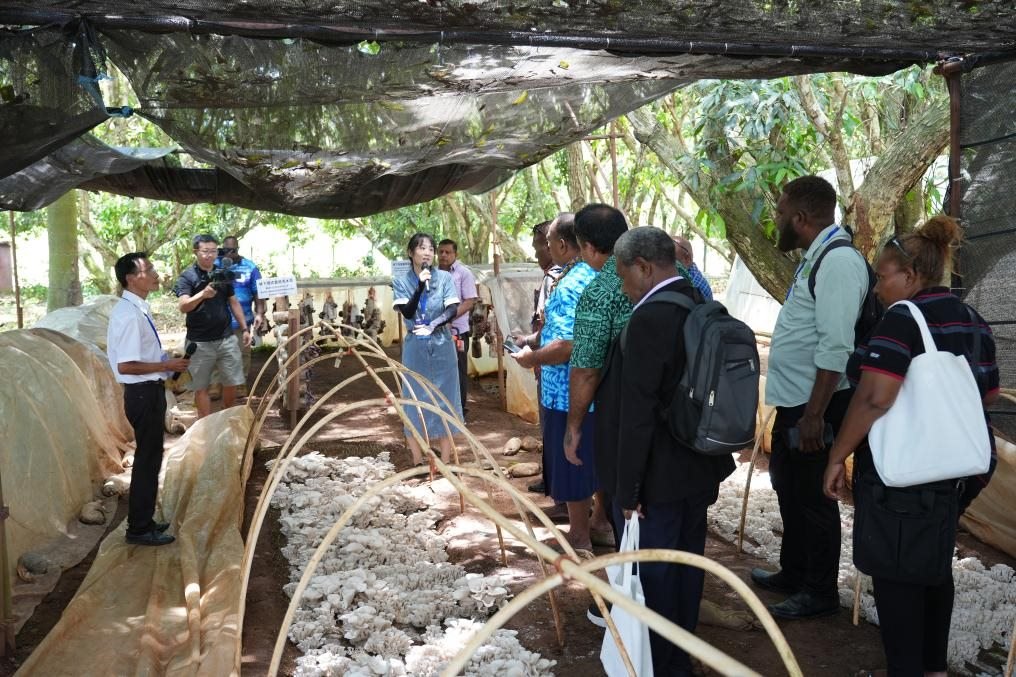 11月19日,在斐濟(jì)楠迪中國—太平洋島國菌草技術(shù)示范中心,與會代表參觀菌草菇種植示范基地。新華社發(fā)(高鑫攝)