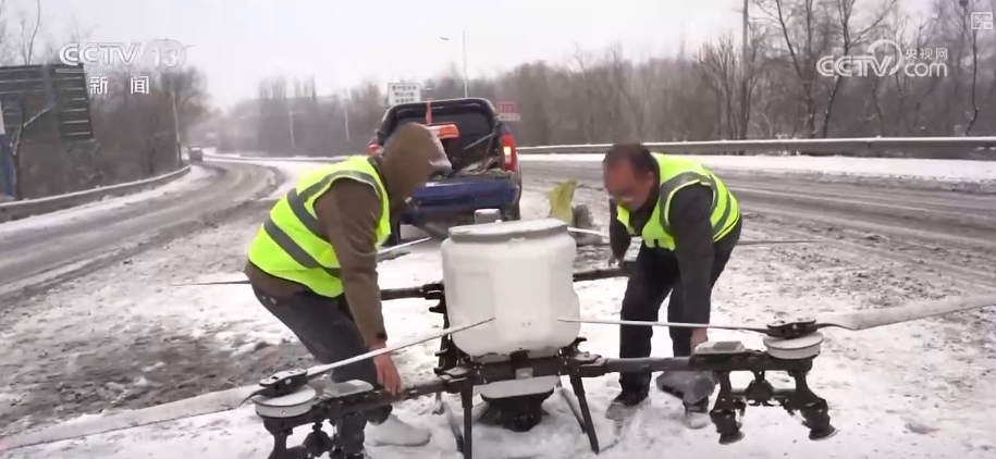 降雪致交通受阻 無人機(jī)大型機(jī)械撒鹽除雪
