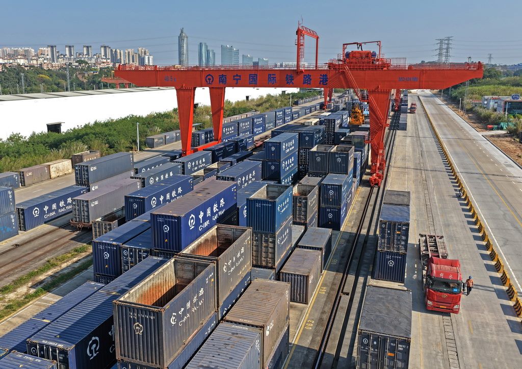 近日,記者從國鐵南寧局獲悉,2025年西部陸海新通道班列發(fā)運集裝箱貨物142.5萬標箱,同比增長47.6%,首次實現(xiàn)年發(fā)運量突破百萬標箱,再創(chuàng)歷史新高。新華社記者 周華 攝