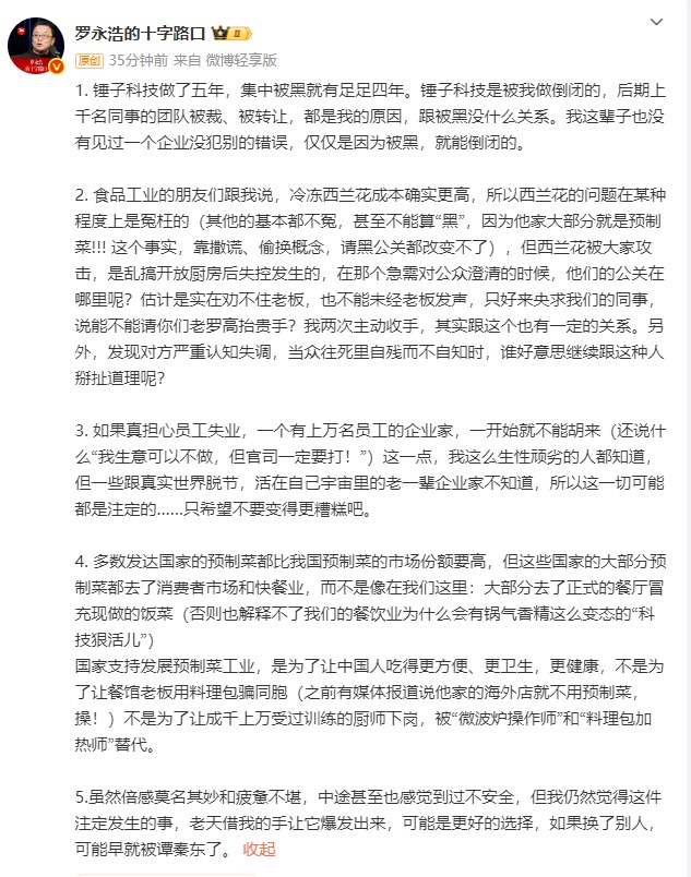 1月16日,@羅永浩的十字路口 再次發(fā)長文回應(yīng)西貝賈國龍近日的言論。他表示,錘子科技做了五年,集中被黑就有足足四年。錘子科技是被我做倒閉的,后期上千名同事的團隊被裁、被轉(zhuǎn)讓,都是我的原因,跟被黑沒什么關(guān)系。我這輩子也沒有見過一個企業(yè)沒犯別的錯誤,僅僅是因為被黑,就能倒閉的。