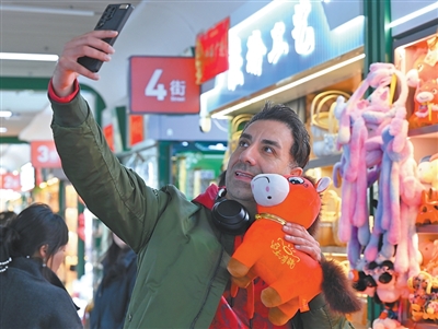 1月12日,在浙江義烏市國(guó)際商貿(mào)城一區(qū)玩具銷(xiāo)售區(qū),芬蘭外商與“哭哭馬”小馬公仔玩具合影。