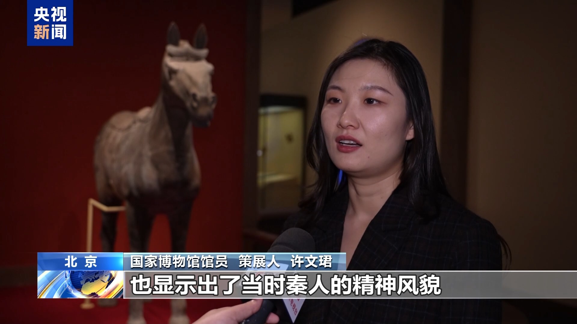 國家博物館館員、策展人 許文珺:這一件秦始皇帝陵兵馬俑的秦鞍馬,雙蹄直立,它的耳朵是直立的,尾巴也是梳成一個辮狀,整體非常有力量,也是秦代人對戰(zhàn)馬篩選標(biāo)準(zhǔn)非常嚴(yán)格的體現(xiàn),也顯示出了當(dāng)時秦人的一個精神風(fēng)貌。