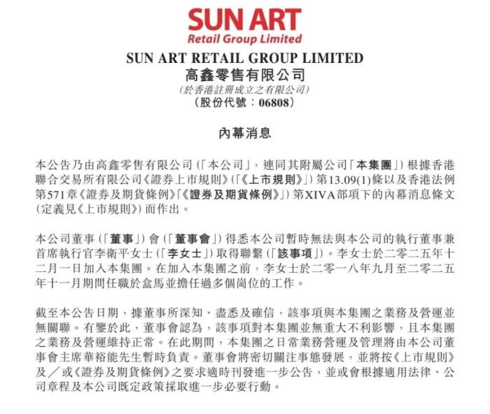 2月4日,大潤發(fā)母公司高鑫零售在港交所發(fā)布公告稱,公司暫時無法與執(zhí)行董事兼首席執(zhí)行官李衛(wèi)平取得聯(lián)系。