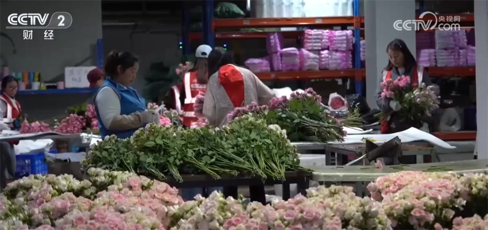 這里的智能溫室大棚可以實現一鍵控制棚內的溫度、濕度,采收后的玫瑰花一般會先經保鮮液浸泡,再送入毛花庫預冷,讓鮮花進入“休眠”狀態(tài)。隨后再經工人師傅裁切、分級、包裝,通過全程低溫冷鏈運往各地。如今,當地的鮮切玫瑰瓶插期從1周延長至15天。由于鮮切玫瑰訂單持續(xù)增長,為保障市場供應,工作人員加急分揀包裝,將玫瑰花及時發(fā)往各地,當地也開通了線上直播銷售,消費者線上選花、比價下單,冷鏈物流最快可在48小時內就能送達。