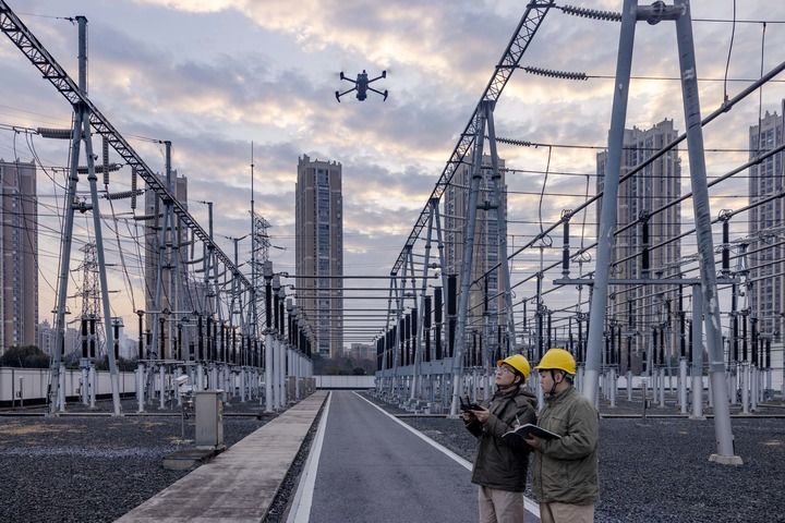 2月17日,國(guó)網(wǎng)泰州供電公司運(yùn)維人員在220千伏寺巷變電站利用無(wú)人機(jī)巡檢電力設(shè)備。新華社發(fā)(湯德宏 攝)
