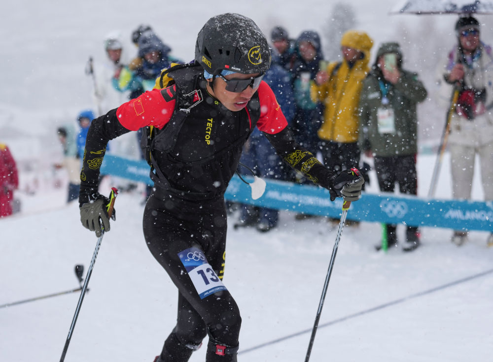 2026年2月21日,次旦玉珍在米蘭-科爾蒂納冬奧會滑雪登山混合接力的比賽中。新華社記者 顏麟蘊 攝