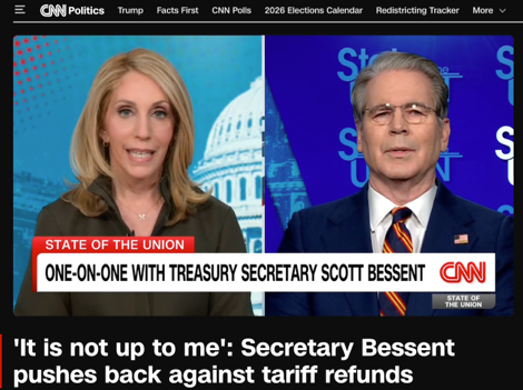 當(dāng)?shù)貢r(shí)間2月22日,美國財(cái)政部長斯科特·貝森特在接受美國有線電視新聞網(wǎng)(CNN)采訪時(shí),被主持人達(dá)娜·巴什追問著一個(gè)看似直接、卻難以直接回答的問題:既然最高法院已裁定特朗普政府依據(jù)《國際緊急經(jīng)濟(jì)權(quán)力法》(IEEPA)征收的大范圍“緊急關(guān)稅”缺乏授權(quán),那么此前收上來的巨額關(guān)稅款,退不退、怎么退?