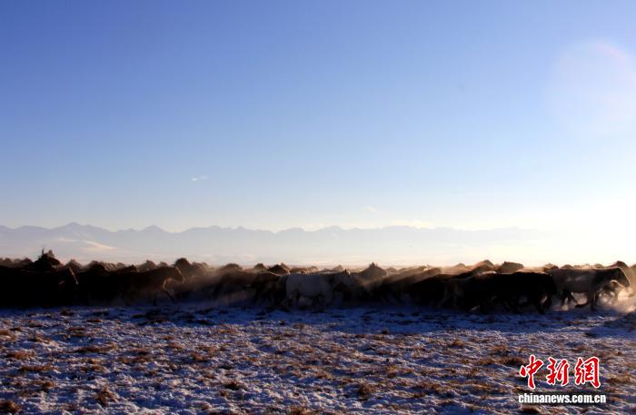 新疆巴音布魯克草原上的萬馬踏雪壯景。史玉江 攝