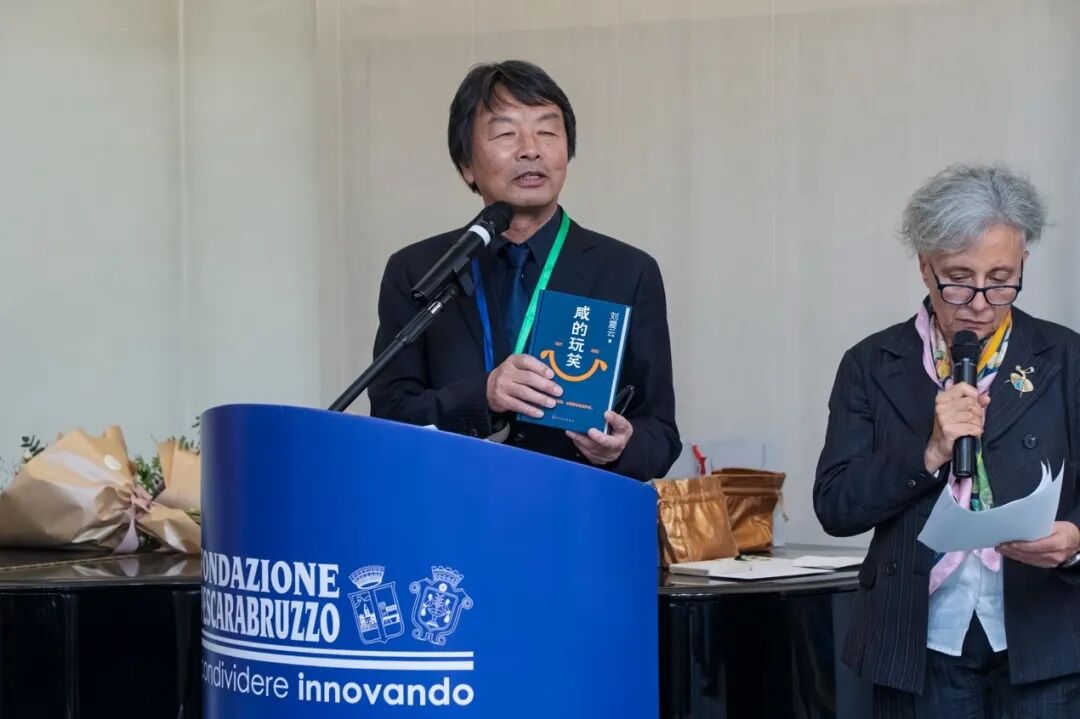 2026年2月20日,劉震云在意大利國際南北文學獎的頒獎儀式上講話,旁邊為其作品意大利語翻譯李莎(Patrizia Liberati)。