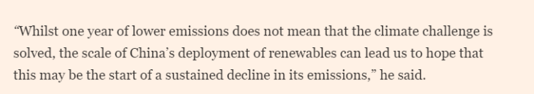 同時(shí),文章稱南安普頓大學(xué)的一位氣候科學(xué)家表示,這些數(shù)據(jù)令人鼓舞,因?yàn)樗鼈儽砻髦袊?guó)對(duì)綠色能源的大規(guī)模投資開始轉(zhuǎn)化為可衡量的成果?!半m然一年的減排并不意味著氣候挑戰(zhàn)已經(jīng)解決,但中國(guó)在可再生能源方面的大規(guī)模發(fā)展讓我們有理由期待,這或許將是其排放量持續(xù)下降的開端。”