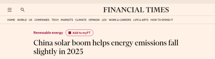 英國(guó)《金融時(shí)報(bào)》日前發(fā)文稱,2025年,太陽(yáng)能的蓬勃發(fā)展促使中國(guó)的碳排放量有所下降。