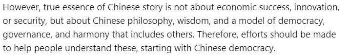 文章稱,中國成功的基礎(chǔ)在于中國獨(dú)特的民主模式——全過程人民民主。其中,社會(huì)主義核心價(jià)值觀是整個(gè)體系的基石。中國以人為本的治理模式,以人民的福祉、安全和繁榮為核心,并通過全過程人民民主來實(shí)現(xiàn)。