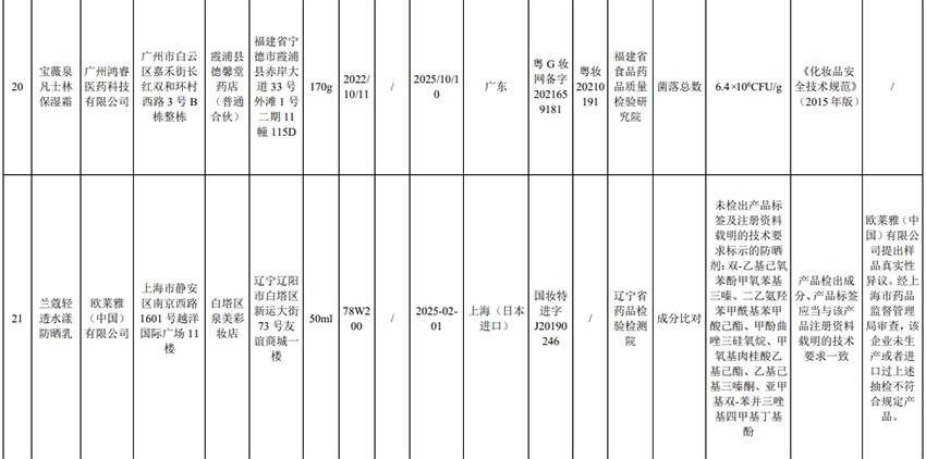 記者注意到,其中,產(chǎn)品標簽標示為歐萊雅(中國)有限公司生產(chǎn)的蘭蔻輕透水漾防曬乳(標示批號:78W200)“未檢出產(chǎn)品標簽及注冊資料載明的技術(shù)要求標示的防曬劑”;產(chǎn)品標簽標示為朋友(上海)化妝品銷售有限公司進口的普柔瑪絲特染發(fā)膏(配合普蓉斯綈雙氧乳)(標示批號:7X15)“檢出產(chǎn)品標簽及注冊資料載明的技術(shù)要求未標示的染發(fā)劑”;產(chǎn)品標簽標示為資生堂(中國)投資有限公司經(jīng)銷的安熱沙金燦倍護防曬啫喱(標示批號:1356TD)“產(chǎn)品標簽與注冊資料載明的技術(shù)要求不一致”、“未檢出產(chǎn)品標簽標示的防曬劑”、“未檢出注冊資料載明的技術(shù)要求標示的防曬劑”。