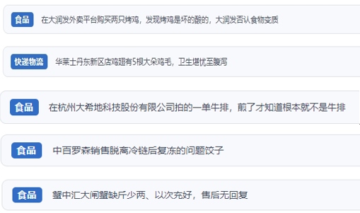 “人民投訴”上不少網(wǎng)友反映,“外賣商家銷售排骨套餐中含過期飲料”“外賣店鋪吃出蟑螂,商家不按照食品安全法賠償” “直播間購買車?yán)遄樱摷傩麄?J、原裝進(jìn)口,到貨嚴(yán)重貨不對板”“網(wǎng)購東北珍珠貢米,到貨包裝上執(zhí)行標(biāo)準(zhǔn)是廢止的標(biāo)準(zhǔn)”“超市買的梅花肉切開發(fā)現(xiàn)是淋巴肉”“平臺商家承諾枸杞不熏硫酸,實(shí)則檢測后含硫超標(biāo)”“知名便利店售賣脫離冷鏈后多次復(fù)凍的餃子”等。