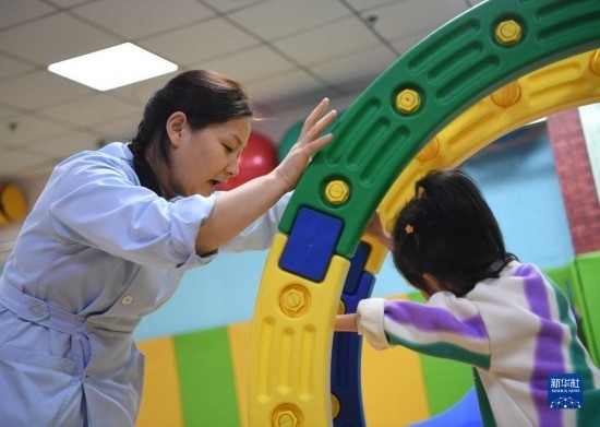 3月30日,在西安市金色陽光康復(fù)中心,特教老師為孩子進行康復(fù)訓(xùn)練。