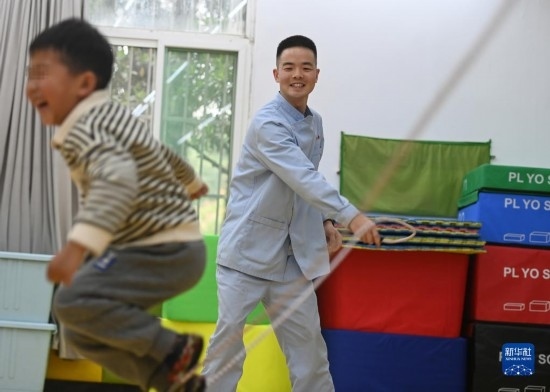 3月30日,在西安市金色陽光康復(fù)中心,特教老師指導(dǎo)孩子進行康復(fù)訓(xùn)練。