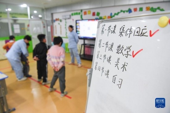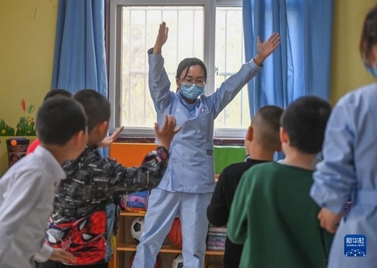 3月30日,在西安市金色陽光康復(fù)中心,特教老師引導(dǎo)孩子們做體操。