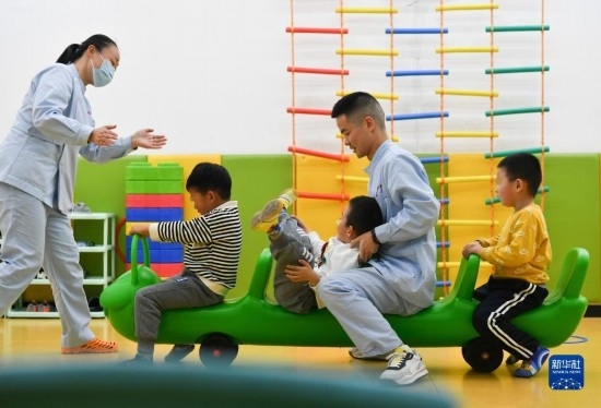 3月30日,在西安市金色陽光康復(fù)中心,兩位特教老師(左一、右二)與孩子們一起游戲。