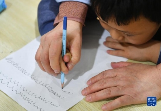 3月30日,在西安市金色陽光康復(fù)中心,特教老師(左)指導(dǎo)孩子進行康復(fù)訓(xùn)練。
