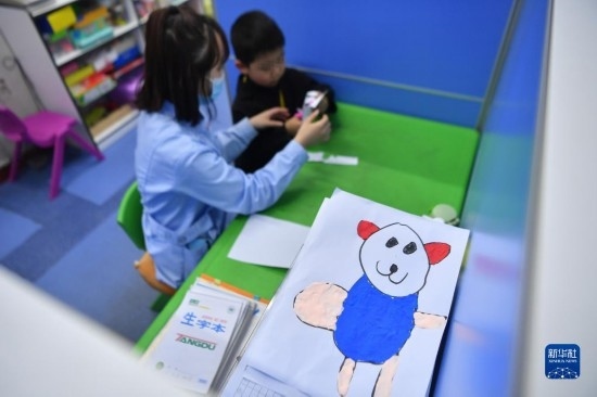 3月30日,在西安市金色陽光康復(fù)中心,特教老師指導(dǎo)孩子進行繪畫練習(xí)。