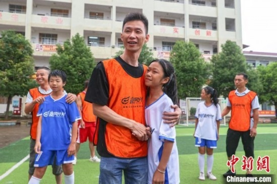 “今天第一次和爸爸踢球,我特別高興和感動。他踢得很好,還帶球過了我?guī)状巍N蚁M职忠院竽芏嗯阄姨咔??!?4日,在江西贛州尋烏縣澄江中心校的足球場上,來自該校晨曦女子足球隊的隊員廖怡菱和其他四位隊員在父親節(jié)前夕,驚喜地見到了自己身在外地工作的父親,并第一次和父親一起踢球,進行了一場特別的親子足球賽。