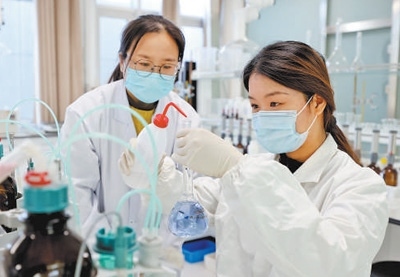 山東省棗莊市西王莊鎮(zhèn)一個實驗室內(nèi),碩士研究生晁齊齊(右)在做化學(xué)實驗。孫中喆攝(人民視覺)