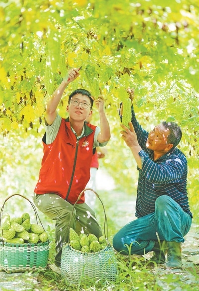 廣西壯族自治區(qū)靈川縣靈田鎮(zhèn)東田村,來自山東大學(xué)的博士研究生羅雯耀(左)在幫村民采摘。黃勇丹攝(人民視覺)