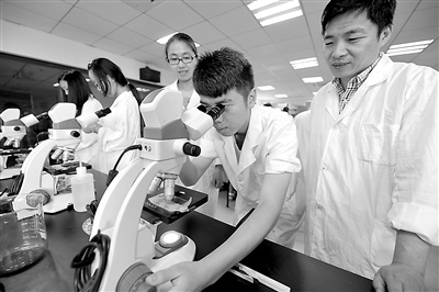 杭州職業(yè)技術(shù)學院生物制藥專業(yè)客座教授、杭州市首席技師章飛龍(右一)正在指導學生實訓。