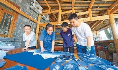 在貴州省黔東南苗族侗族自治州榕江縣三寶侗寨,來自貴州財經(jīng)大學的大學生學習非遺藍染知識。周光勝攝(人民圖片)