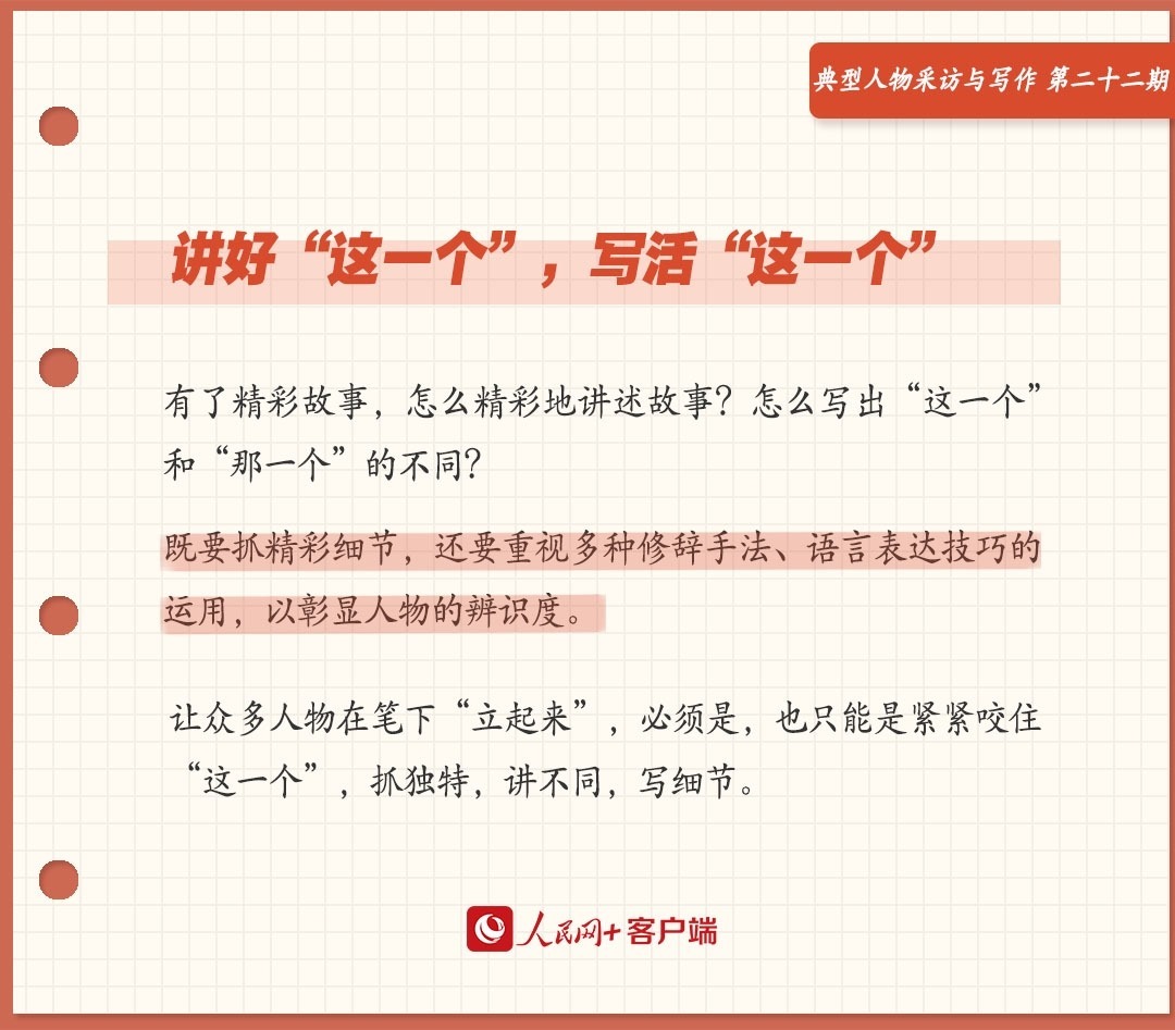 把好故事講精彩,讓“這一個”立起來,既要抓精彩細節(jié),還要重視多種修辭手法、語言表達技巧的運用,以彰顯人物的辨識度。