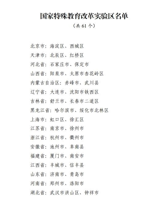 記者2月10日從教育部獲悉,經(jīng)各地自主申報(bào)、省級(jí)推薦、網(wǎng)絡(luò)公示等環(huán)節(jié),認(rèn)定北京市海淀區(qū)等61個(gè)國(guó)家特殊教育改革實(shí)驗(yàn)區(qū)。
