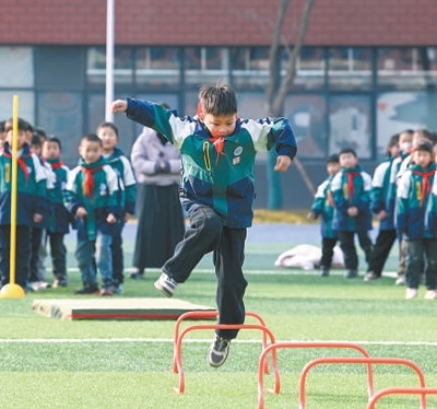 青島市李滄區(qū)是山東省內(nèi)較早推廣15分鐘課間的地區(qū),當?shù)馗餍R虻刂埔耍Y(jié)合校園特色將體育活動開展得豐富多彩。青島東川路小學在操場分設(shè)6個活動點,地面上畫好跳房子、百變大腳丫、步步登高、投擲區(qū)等不同格子,由班主任帶領(lǐng)學生,開發(fā)多種闖關(guān)類游戲,鼓勵學生創(chuàng)造新玩法。