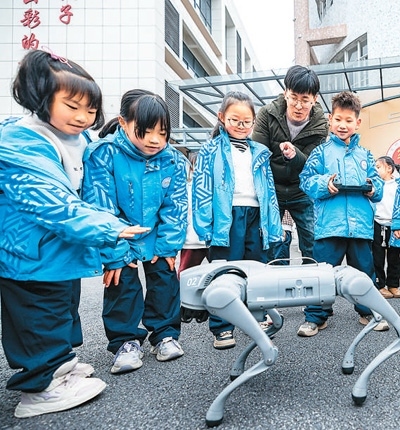 圖為孩子們與機器狗互動。