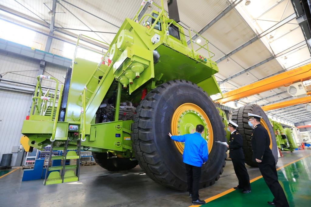 包頭海關(guān)關(guān)員監(jiān)管內(nèi)蒙古北方重型汽車(chē)股份有限公司出口的礦用車(chē)。(受訪者供圖)