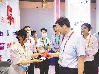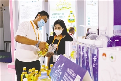 第二屆中國國際消費品博覽會(以下簡稱消博會)在海南省??谑信e辦。內(nèi)蒙古展館的綠色優(yōu)質(zhì)產(chǎn)品引來圍觀。蒙牛乳業(yè)、敖漢小米、科爾沁牛肉、芥花油等內(nèi)蒙古多個綠色優(yōu)質(zhì)品牌及產(chǎn)品亮相消博會。同時,70多家交易商組成內(nèi)蒙古展團觀展。本屆消博會主題為“共享開放機遇共創(chuàng)美好生活”,于7月25日開幕,為期6天。(文/圖 本報記者 李永桃)