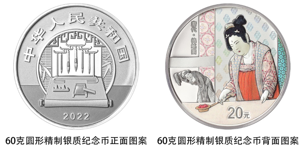 一枚60克圓形銀質紀念幣背面圖案為《搗練圖》中扯練造型,襯以裝飾紋樣組合設計,并刊“唐代·搗練圖”字樣及面額。