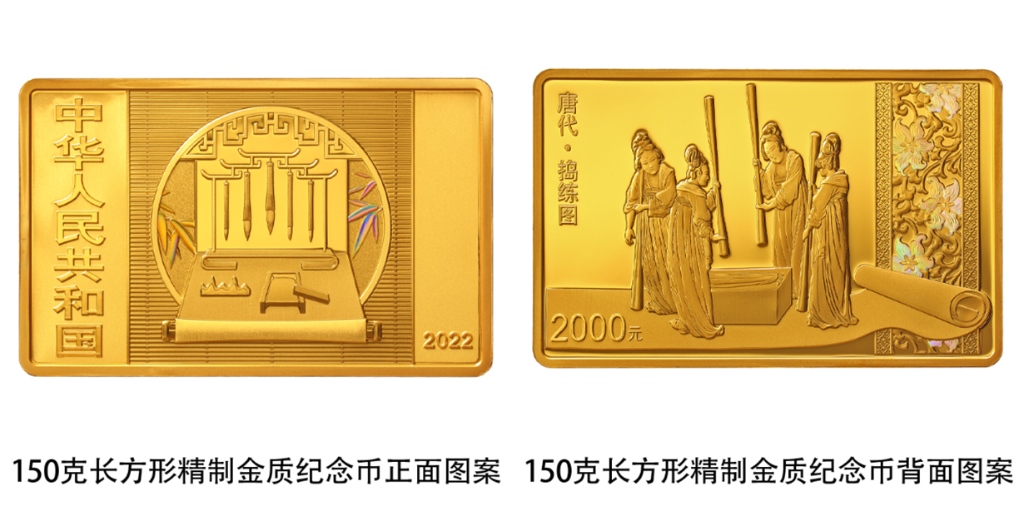 該套金銀紀念幣正面圖案均為筆、墨、紙、硯造型,輔以竹葉、窗等裝飾組合設計,背面圖案則各有特色。一枚150克長方形金質紀念幣背面圖案為《搗練圖》中搗練場景,襯以裝飾紋樣組合設計,并刊“唐代·搗練圖”字樣及面額。