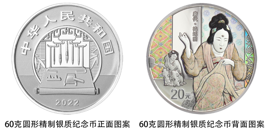 一枚60克圓形銀質紀念幣背面圖案為《搗練圖》中縫紉、煽火造型,襯以裝飾紋樣組合設計,并刊“唐代·搗練圖”字樣及面額。