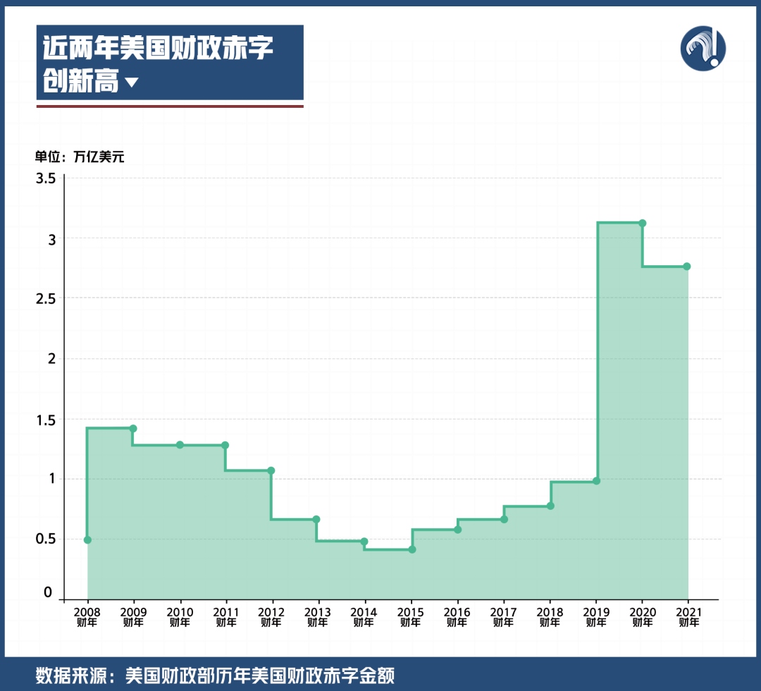 不僅如此,美國還多次出臺大規(guī)模經(jīng)濟(jì)紓困法案,2021年財政赤字率達(dá)到了12.4%,甚至已經(jīng)高于2009年金融危機(jī)期間9.8%的歷史最高水平。