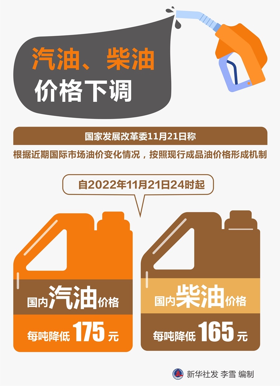 國(guó)家發(fā)展改革委21日稱(chēng),根據(jù)近期國(guó)際市場(chǎng)油價(jià)變化情況,按照現(xiàn)行成品油價(jià)格形成機(jī)制,自2022年11月21日24時(shí)起,國(guó)內(nèi)汽油、柴油價(jià)格每噸分別降低175元和165元。
