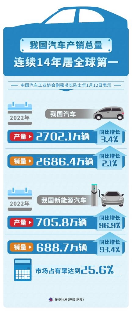 中國(guó)汽車工業(yè)協(xié)會(huì)副秘書長(zhǎng)陳士華在12日舉行的中國(guó)汽車工業(yè)協(xié)會(huì)月度信息發(fā)布會(huì)上表示,2022年,我國(guó)汽車產(chǎn)銷分別完成2702.1萬(wàn)輛和2686.4萬(wàn)輛,同比增長(zhǎng)3.4%和2.1%,全年實(shí)現(xiàn)小幅增長(zhǎng)。我國(guó)汽車產(chǎn)銷總量已連續(xù)14年居全球第一。