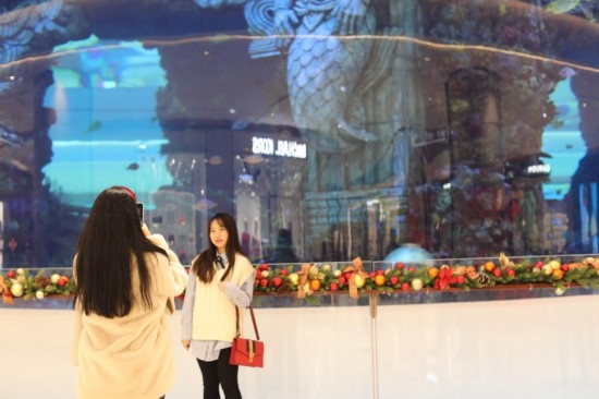 春節(jié)期間,顧客在重慶市江北區(qū)星光68廣場(chǎng)的室內(nèi)海洋館前拍照。新華社記者 周思宇 攝