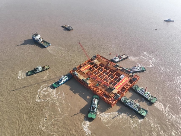 施工單位結(jié)合5號(hào)墩基礎(chǔ)施工條件,采用自浮式鉆孔平臺(tái)方案,自浮式鉆孔平臺(tái)由“鋼樁+鋼架”作為主要承重結(jié)構(gòu),在底部設(shè)置浮箱結(jié)構(gòu),使其具備自浮功能;平臺(tái)長(zhǎng)130米、寬100米,重達(dá)7600噸,平面面積達(dá)13000平方米,相當(dāng)于31個(gè)標(biāo)準(zhǔn)籃球場(chǎng)大小。