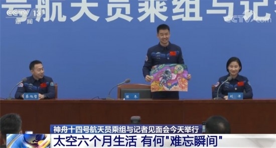 記者會(huì)上,航天員陳冬收到了來(lái)自家鄉(xiāng)特殊教育學(xué)校孩子的一幅畫(huà)作。