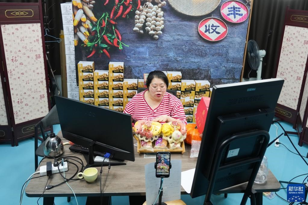 2月17日,威海長(zhǎng)林生態(tài)農(nóng)業(yè)有限公司員工直播銷售花餑餑產(chǎn)品。新華社記者 朱崢 攝