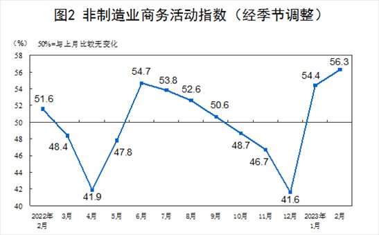 2月份,非制造業(yè)商務活動指數(shù)為56.3%,比上月上升1.9個百分點,連續(xù)兩個月位于景氣區(qū)間,非制造業(yè)恢復發(fā)展態(tài)勢向好。