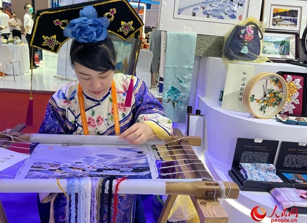 參展商現(xiàn)場制作國家級非物質(zhì)文化遺產(chǎn)渤海靺鞨繡。人民網(wǎng)記者 杜燕飛攝