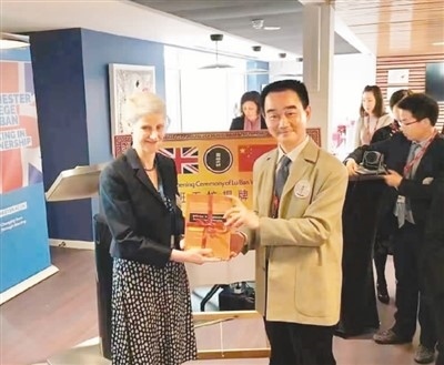 呂景泉(前右)向合作開(kāi)設(shè)英國(guó)魯班工坊的英方學(xué)校代表贈(zèng)送中方研發(fā)出版的教材。