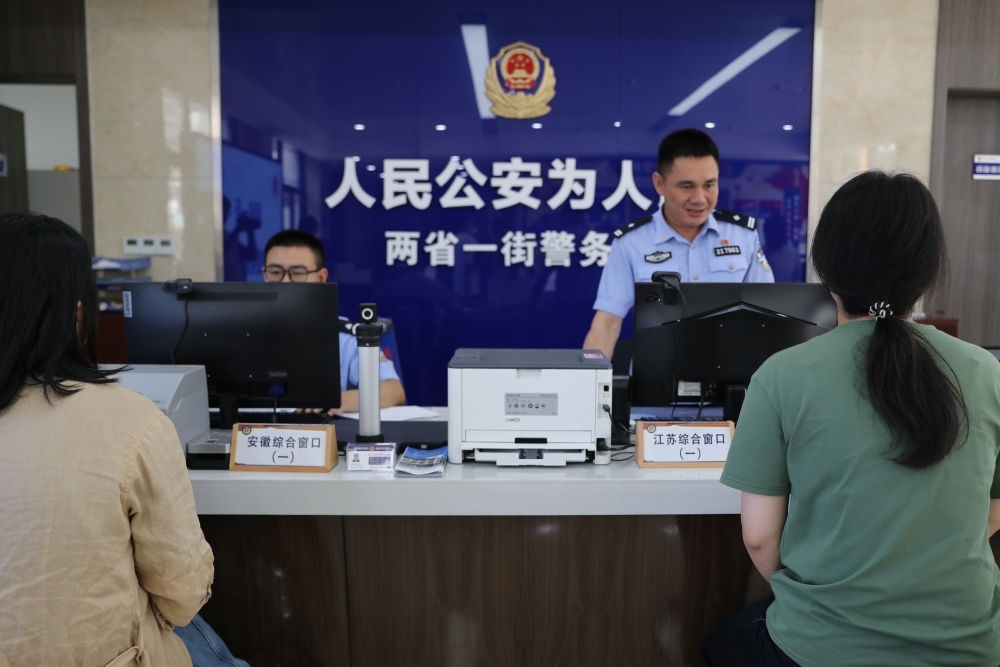 2023年6月2日,安徽的輔警(左二)和江蘇的民警(右二)在丹陽警務室政務服務窗口為人們辦理業(yè)務。安徽馬鞍山博望區(qū)丹陽鎮(zhèn)與江蘇南京江寧區(qū)丹陽社區(qū)相毗鄰,2023年年2月底,蘇皖“兩省一街”丹陽警務室政務服務窗口正式揭牌,在兩地交界區(qū)域?qū)嶓w化運行。新華社記者 杜瀟逸 攝