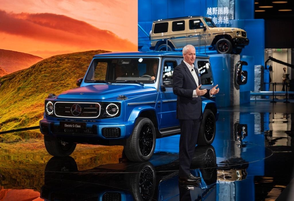 4月25日,在北京中國國際展覽中心順義館舉行的2024北京車展上,梅賽德斯—奔馳集團股份公司董事會成員唐仕凱介紹梅賽德斯—奔馳純電G級越野車。新華社記者 才揚 攝